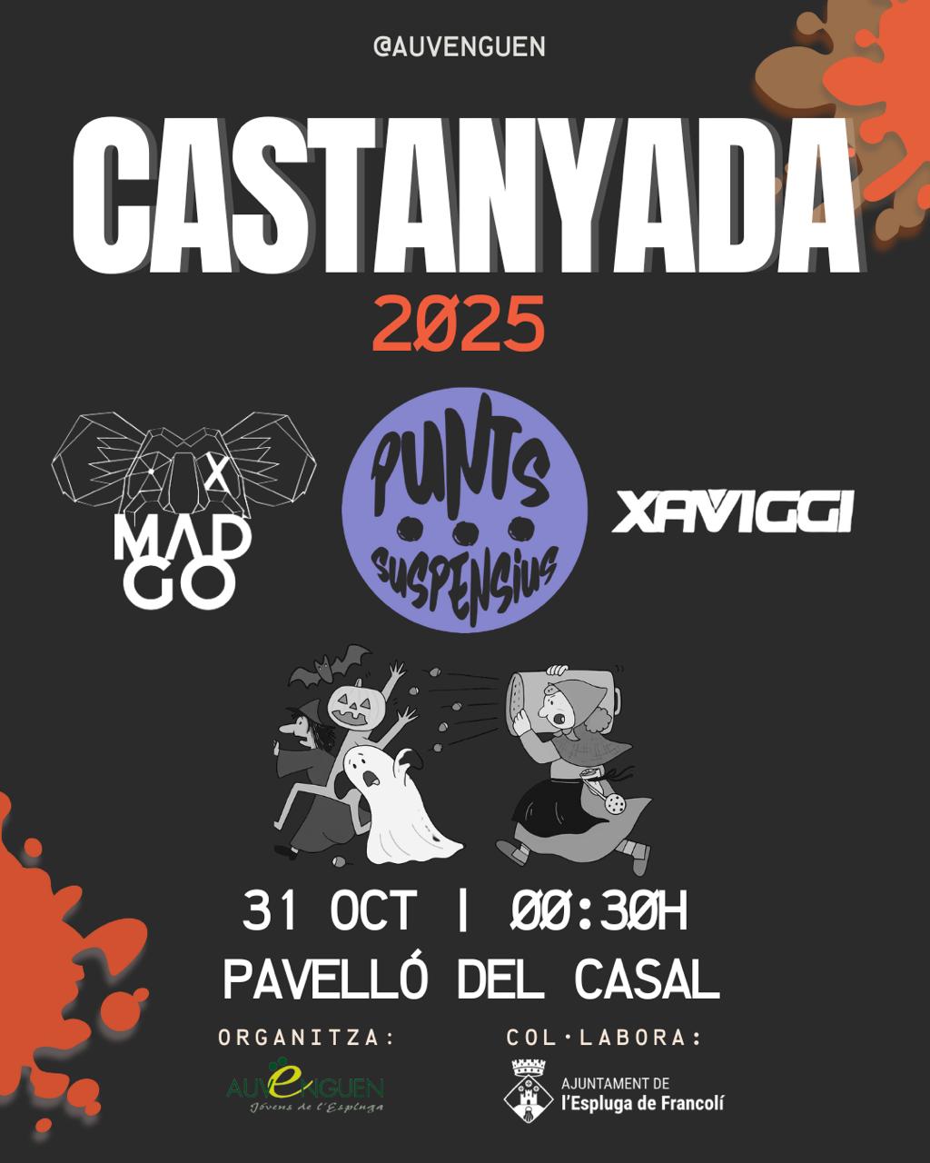 Dia 31 d’octubre al pavelló del Casal a partir de les 00.30h, Festa de la Castanyada amb el grup de versions Punts Suspensius i els Djs Mad Go i Xavi GGi.