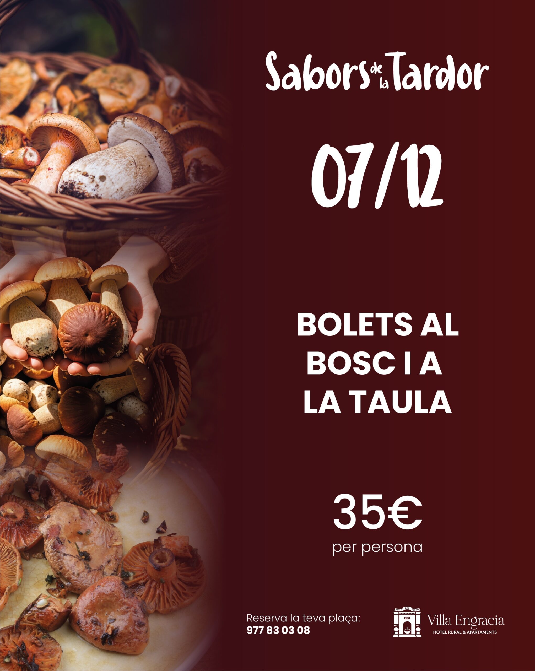 Consistirà en una passejada pel bosc de Poblet i un dinar especial a Villa Engracia amb el Menú Boletaire, on esgaudirà d’una una deliciosa selecció de plats amb bolets de temporada.