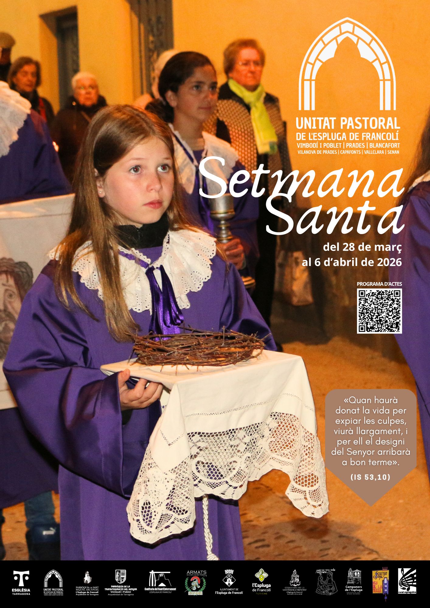 Del 28 de març al 6 d’abril de 2026, consulta tots els actes religiosos que es duran a terme a l’Espluga de Francolí i on també s’engloba diferents pobles com les parròquies com també Vimbodí i Poblet, Prades, Blancafort, Vilanova de Prades, Capafonts, Vallclara, Senan., Prades i Capafonts. Programa d’actes